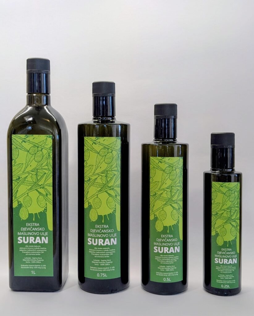 Suran je naše vrhunsko ekstra djevičansko maslinovo ulje proizvedeno isključivo od sorte 100% oblica, poznate po intenzivnom okusu i bogatim aromama. Ova autohtona dalmatinska sorta daje ulju jedinstvenu notu svježine, blage pikantnosti i dugotrajnog aftertastea koji ostaje u ustima.